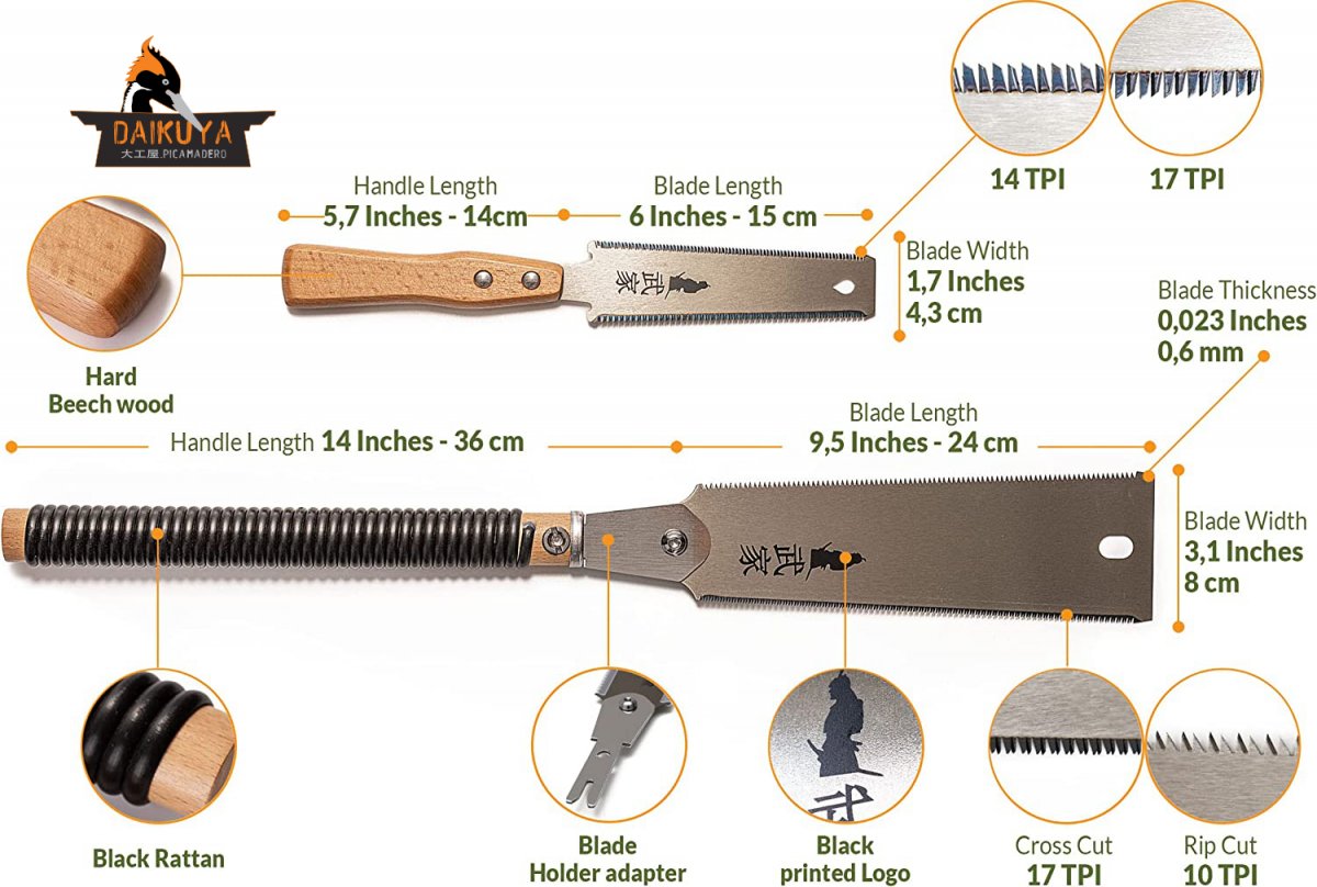 Calidad de fabricación: Esta sierra de mano japonesa tiene una hoja de acero duradera y extra-filosa. Es más delgada y ligera que una sierra de mano habitual, lo que garantiza cortes más estrechos y suaves a través del grano.