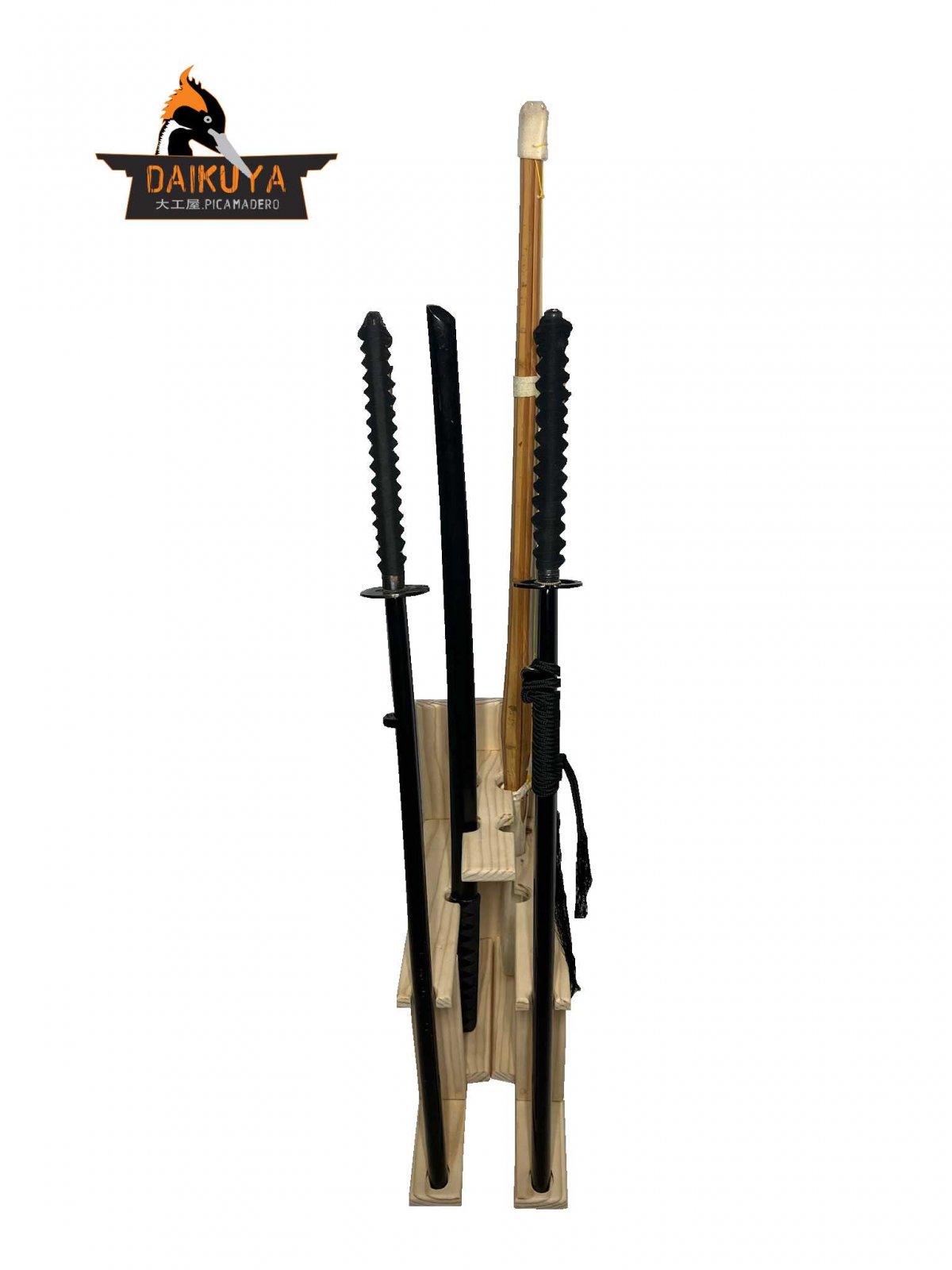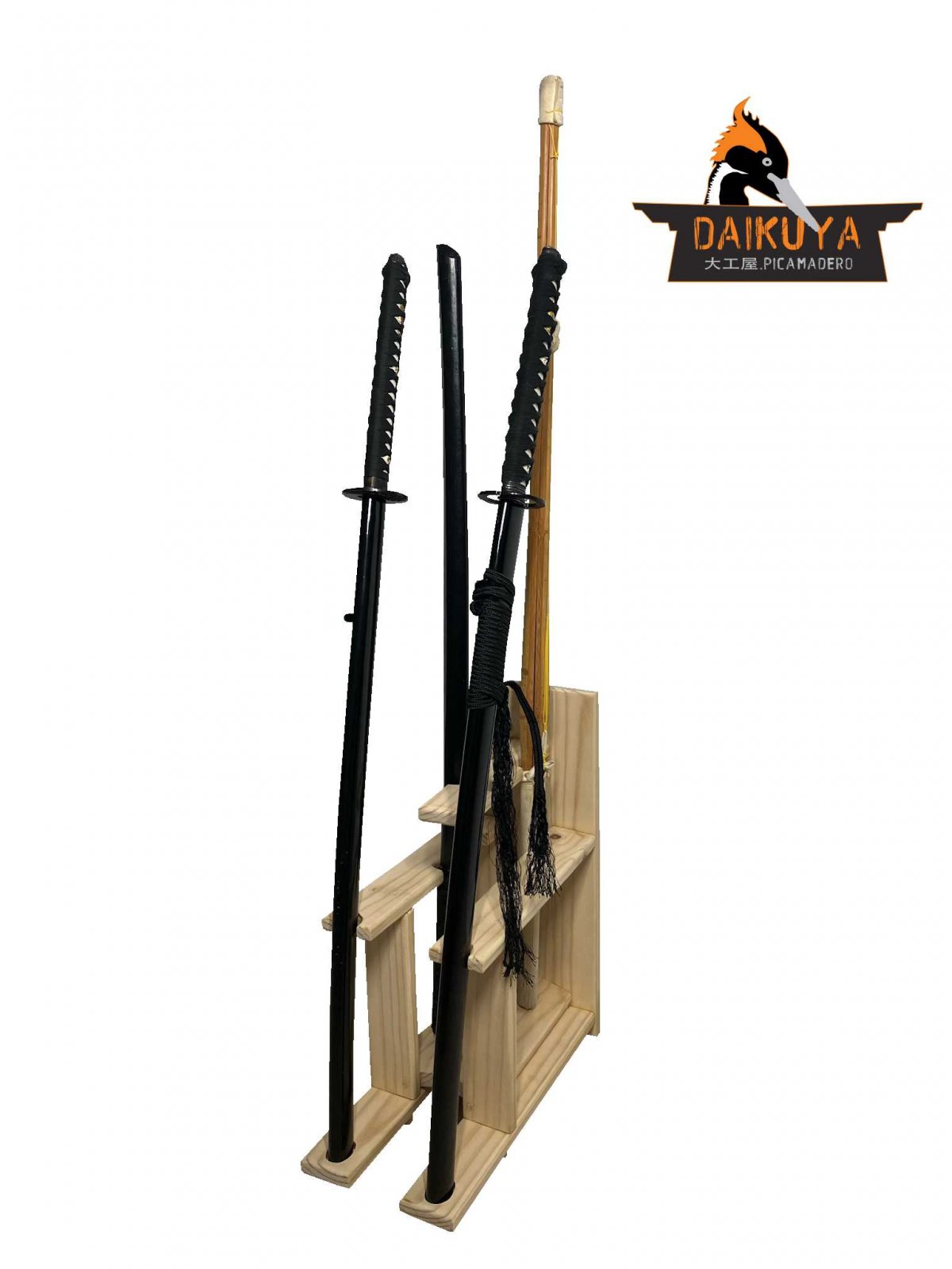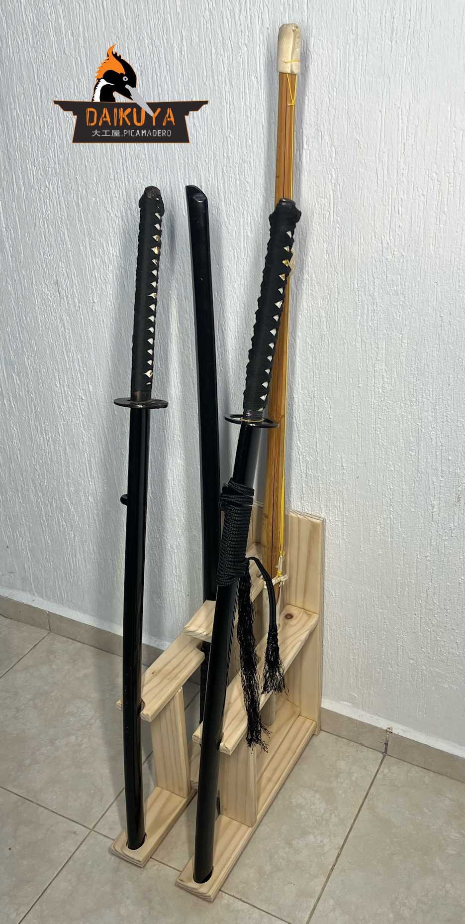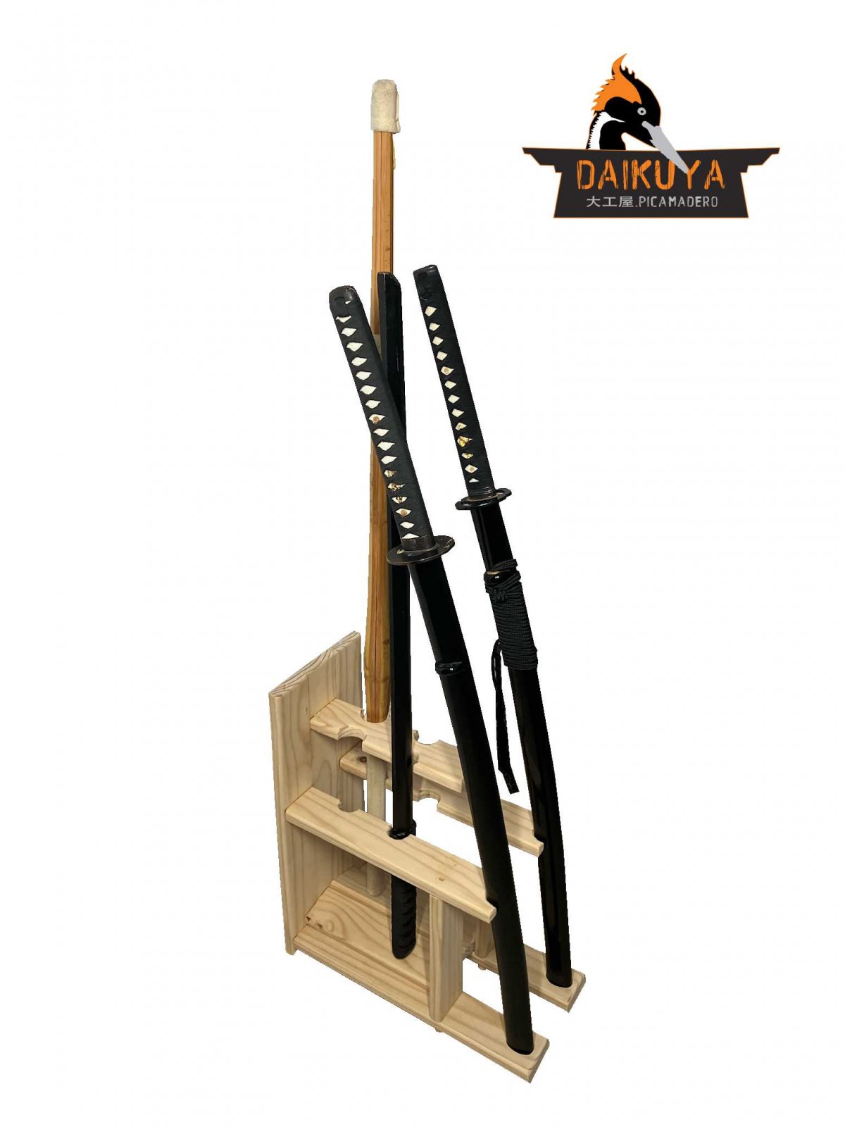 Estante de madera para mantener ordenado el equipo para la práctica del kendo, facilita la disposición de los diferentes shinais y bokkens. Fomentando la disciplina para recorrer el camino de la espada que se enfoca en el control emocional y de los impulsos.